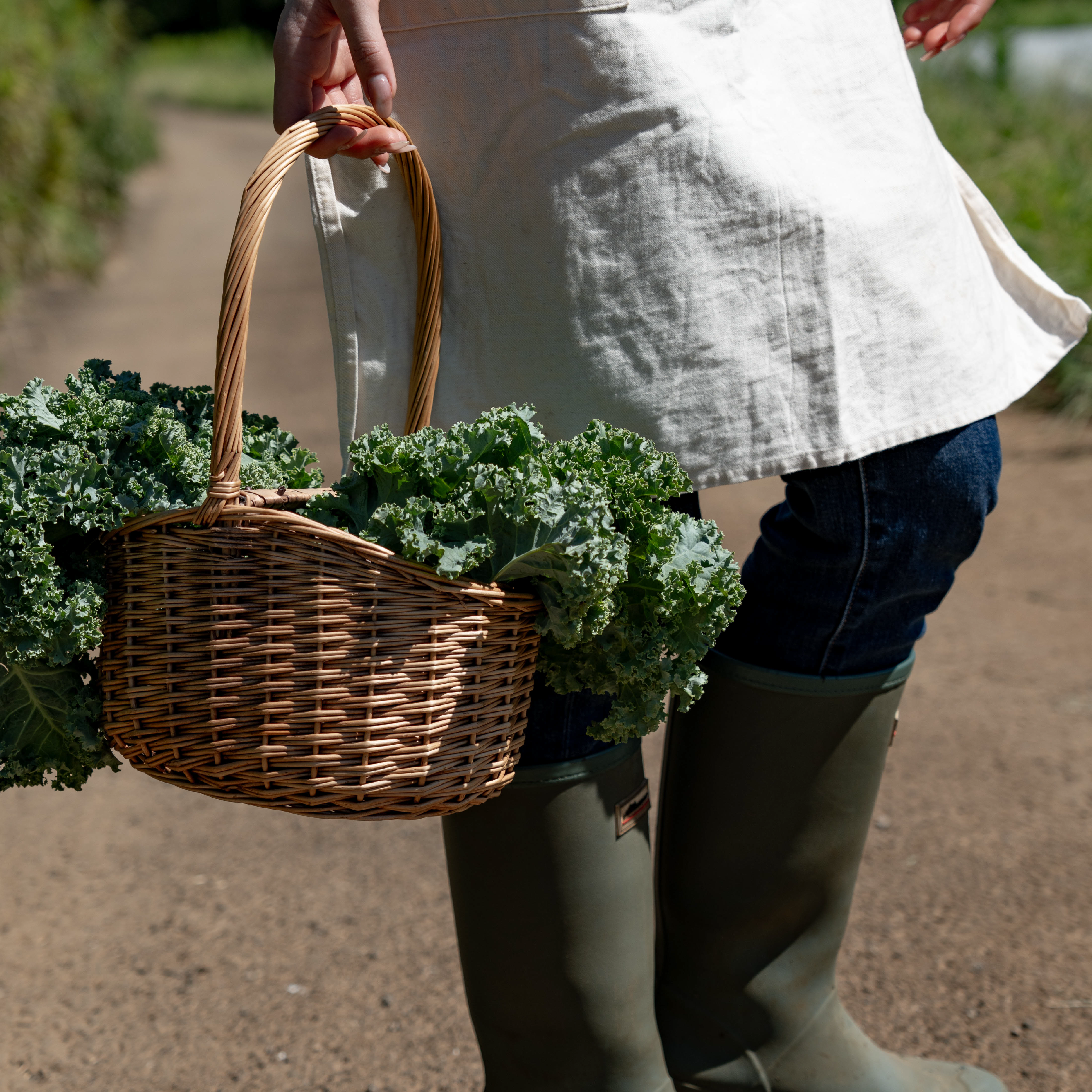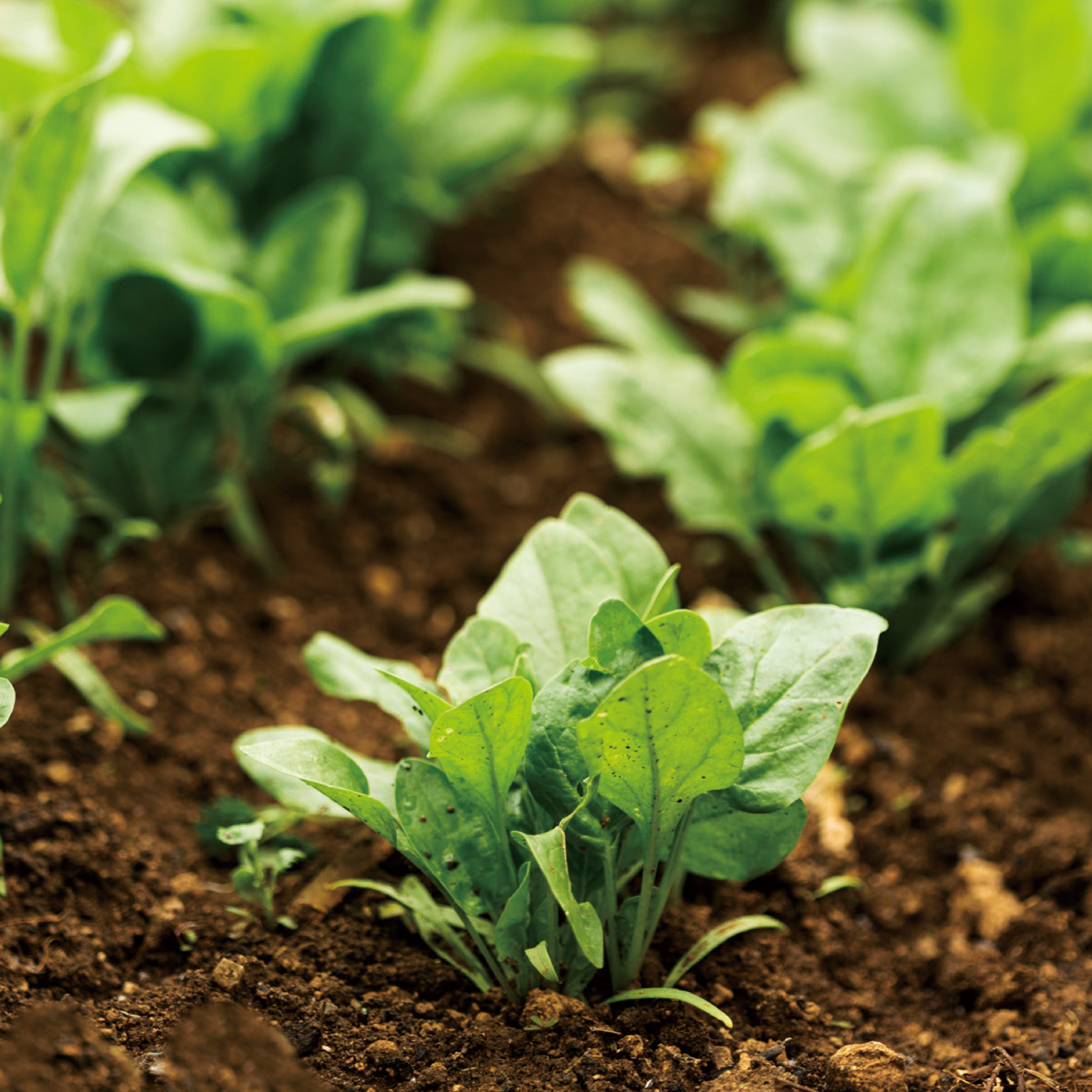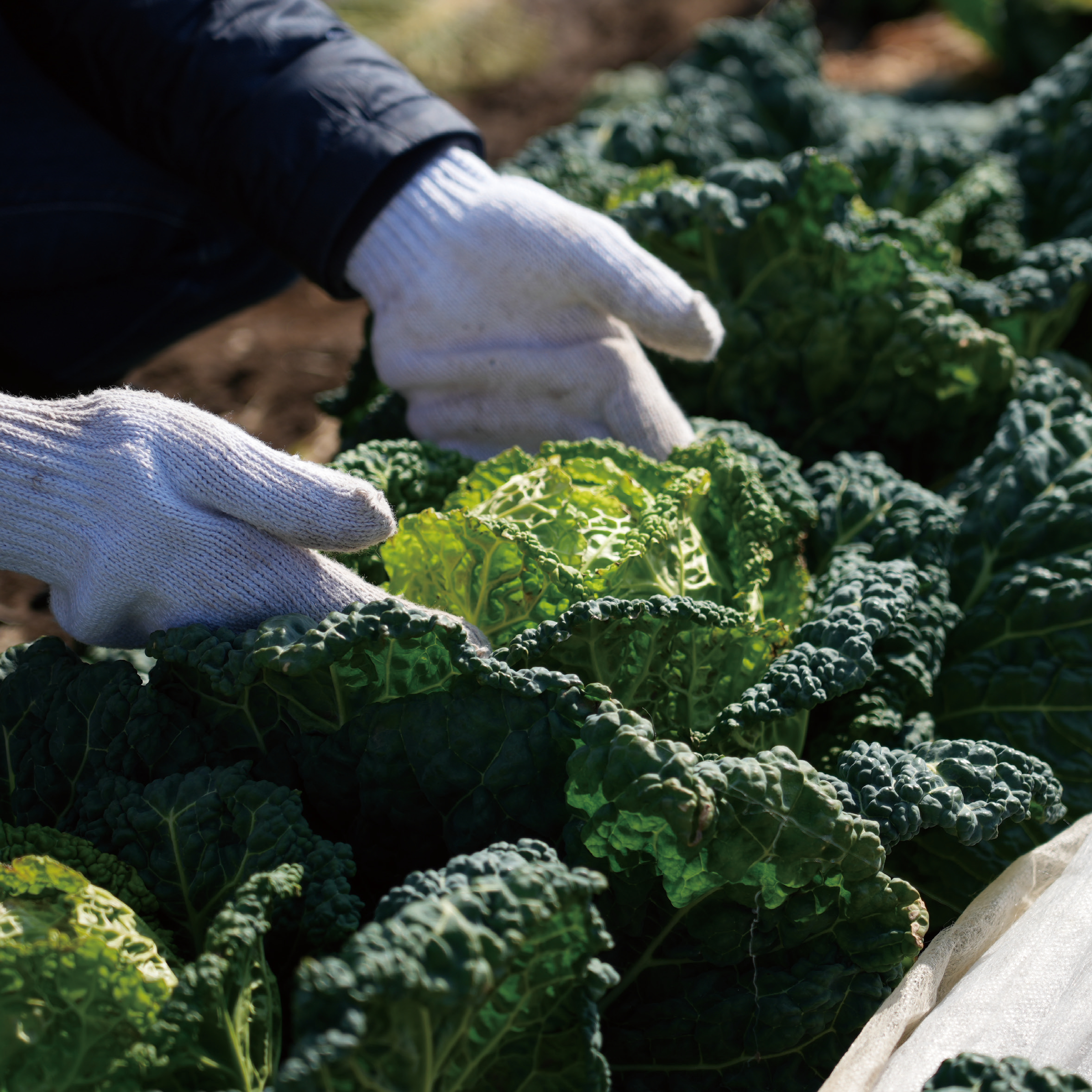 私たちが目指しているのは、土・微生物・植物、それぞれが健やかに循環する、「持続可能な農業」の実現です。農園ではまず、土づくりからスタートします。微生物が豊かに生きる土壌環境を作り、微生物が活発に活動することで土がフカフカになり、根がのびのびと張れる健康な畑が出来上がります。また、輪作(作付けのローテーション)を行うことで、同じ土に負担をかけず、病気の連鎖も防ぎます。この循環型の栽培方法により、野菜本来の生命力と栄養価を引き出しています。収穫時には「香り」「茎のハリ」「葉のツヤ」など、嗅覚、触覚、視覚を使い収穫のタイミングを見極めます。カリーノケールやビーツ、カラフルにんじんなどの品種は通年で栽培。手間をかけて収穫された野菜は、採れたての新鮮さそのままに、すぐに店舗へ直送されます。